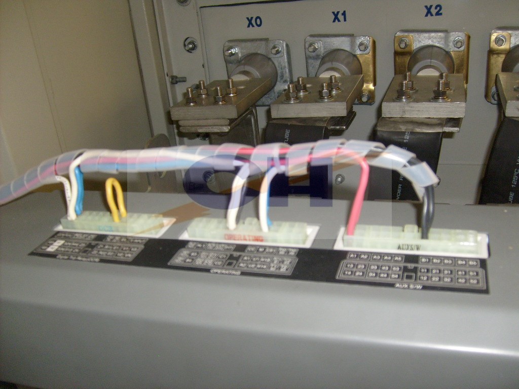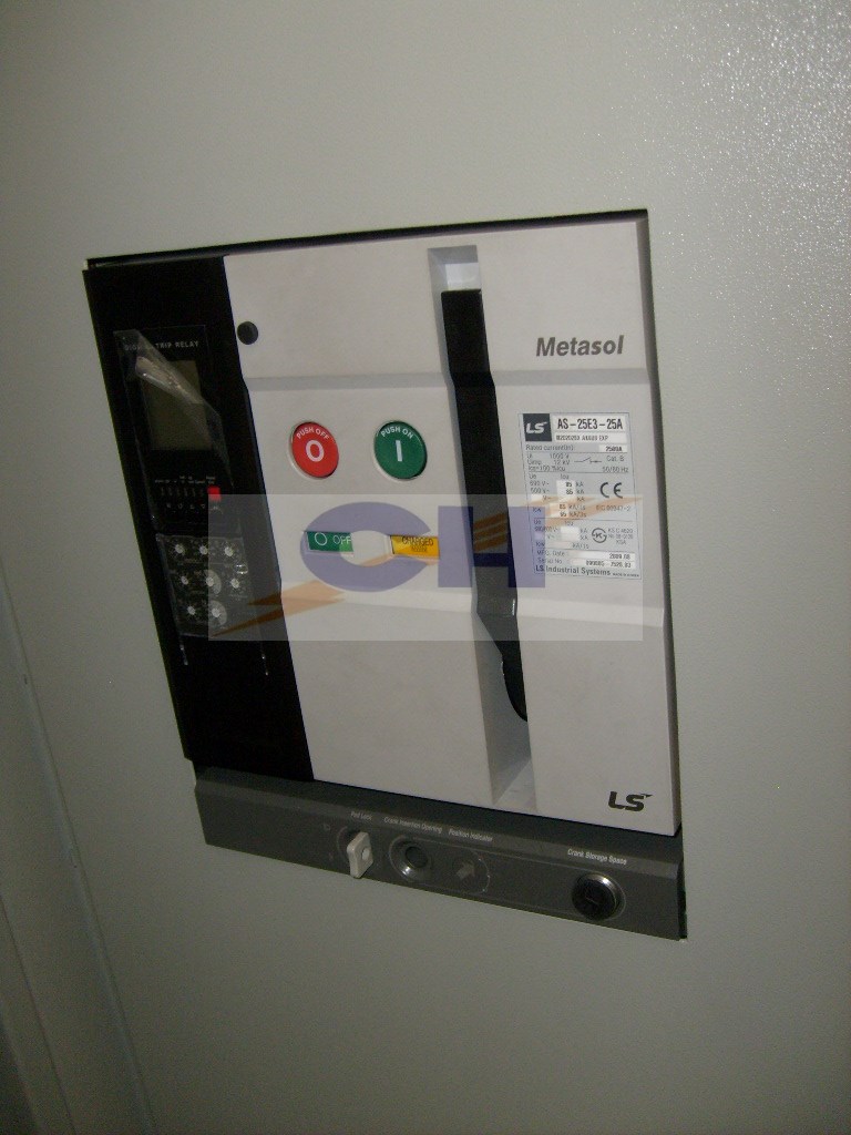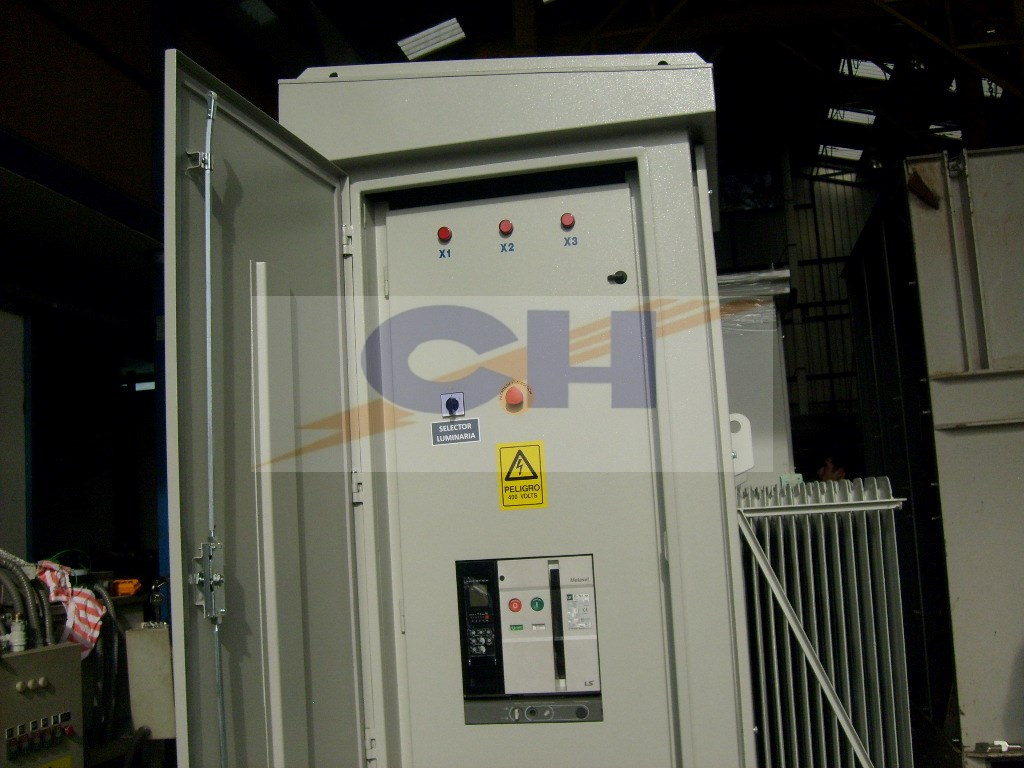 - 1 Interruptor al aire termomagnético (electrónico) regulable de 2500 Amperes, ≥ 85 kA de ruptura, 415 Volts, con una bobina de disparo y contactos auxiliares conectado a relés de protección del transformador, para integrar el sistema de desconexión simultanea local y remota de media tensión y baja tensión.