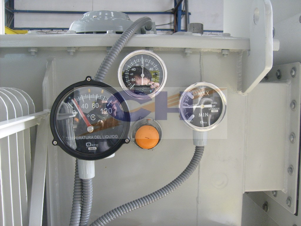 - Termómetro tipo dial para medir temperaturas actual y máxima del aceite FR3, con contactos 2 N.A. y 2 N.C.