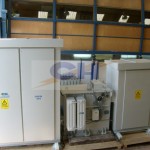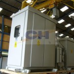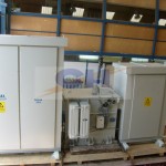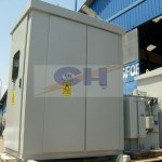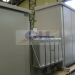 La celda tipo intemperie (IP65) de la subestacion unitaria está construida en plancha de acero A37-24 de 2,5 mm. En su interior incorpora un desconectador fusible en SF6 clase 34,5 kV para operar bajo carga. Posee barras de entrada y salida para conexión de mufas con terminal plano, conectores a tierra de exterior e interior. El mecanismo de operación es independiente del operador, abriendo automáticamente si alguno de los fusibles actúa. Está equipado con contactos auxiliares, 2 NA / 2 NC y bobina de apertura (disparo) en 220 Vca. Diseño robusto y de alta seguridad que impide la conexión a puesta a tierra sin haber abierto (desenergizado) el seccionador principal. La puerta interior de acceso a los fusibles de la subestacion unitaria, tiene un enclavamiento que impide su acceso si el equipo se encuentra cerrado (energizado). Además incorpora un calefactor de 120 W operado por termostato. Las puertas de exterior e interior, tienen mirilla en vidrio templado de seguridad para inspección visual. El interior se ilumina con una lámpara tipo tortuga y 3 leds indicadores de tensión en la conexión de salida. La entrada y salida de cables es por su sócalo inferior a través de tapas metálicas perforables, para instalación de prensaestopas y así asegurar su hermeticidad. Se le realizan en nuestro laboratorio, ensayos de tensión aplicada, resistencia y simultaneidad de contactos, emitiendo certificado de pruebas y garantía de 24 meses.