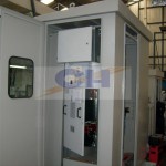 Celda tipo intemperie (IP65) construida en plancha de acero A37-24 de 2,5 mm. En su interior incorpora un desconectador al vacío clase 15 kV para operar bajo carga. La celda de media tensión posee barras de entrada y salida para una conexión con mufas con terminal plano, además de conectores a tierra de exterior e interior. La celda está equipada con contactos auxiliares, 2 NA / 2 NC y una bobina de apertura (disparo) en 220 Vca. El interior se iluminado con una lámpara tipo tortuga. La entrada y salida de los cables es por medio de una sócalo inferior a través de tapas metálicas perforables, para instalación de prensaestopas y así asegurar su hermeticidad.