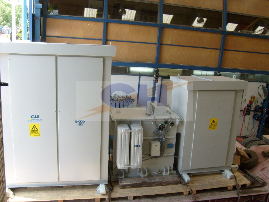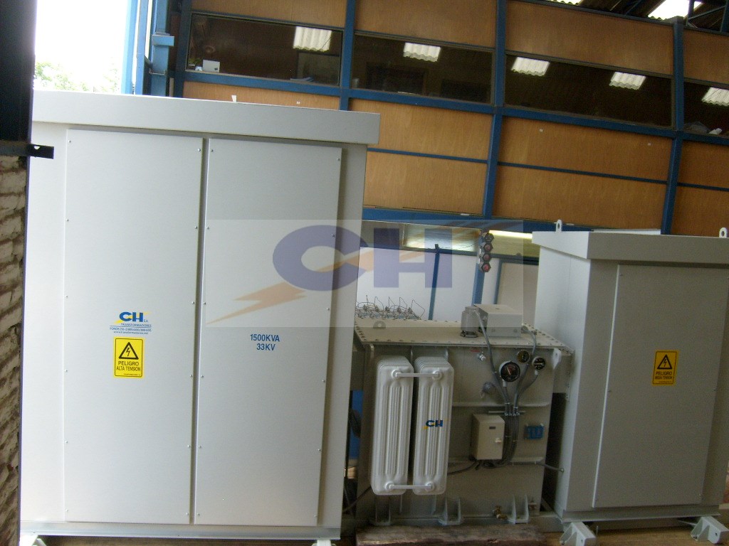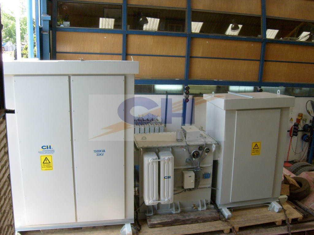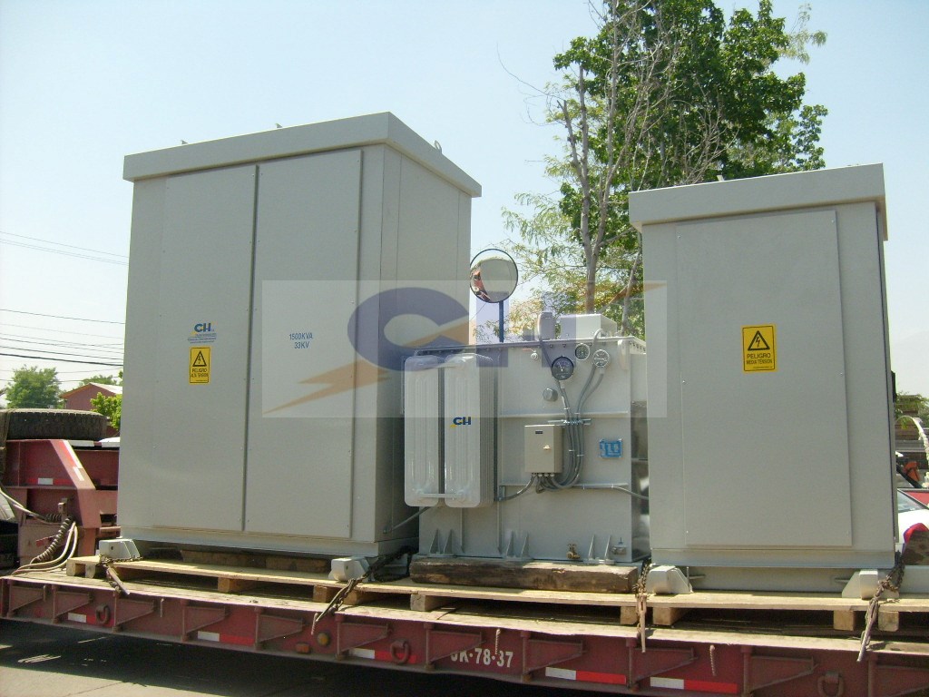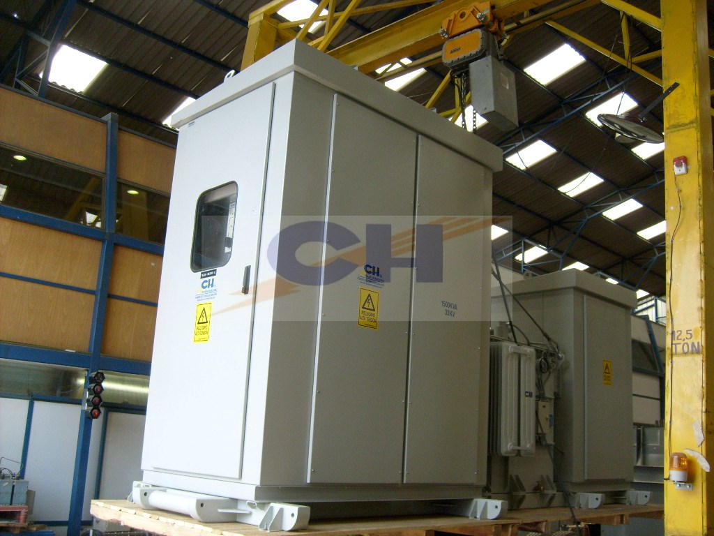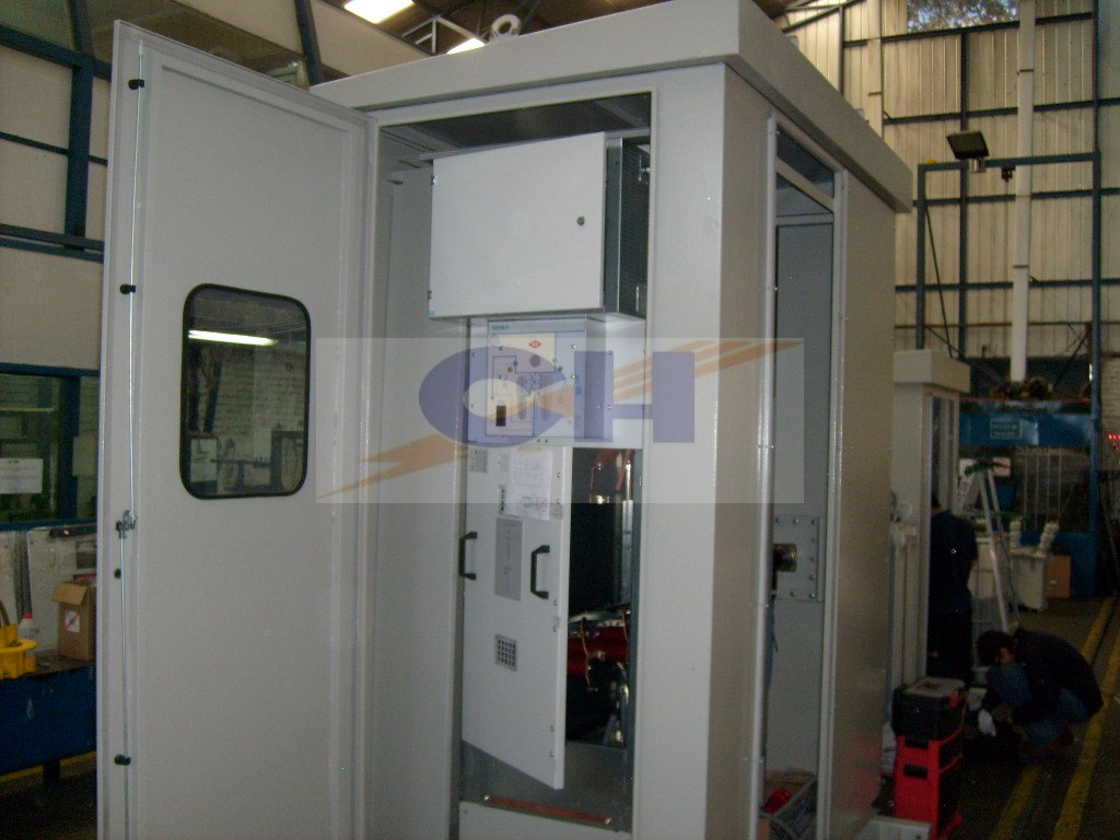 La celda tipo intemperie (IP65) de la subestacion unitaria está construida en plancha de acero A37-24 de 2,5 mm. En su interior incorpora un desconectador fusible en SF6 clase 34,5 kV para operar bajo carga. Posee barras de entrada y salida para conexión de mufas con terminal plano, conectores a tierra de exterior e interior. El mecanismo de operación es independiente del operador, abriendo automáticamente si alguno de los fusibles actúa. Está equipado con contactos auxiliares, 2 NA / 2 NC y bobina de apertura (disparo) en 220 Vca. Diseño robusto y de alta seguridad que impide la conexión a puesta a tierra sin haber abierto (desenergizado) el seccionador principal. La puerta interior de acceso a los fusibles de la subestacion unitaria, tiene un enclavamiento que impide su acceso si el equipo se encuentra cerrado (energizado). Además incorpora un calefactor de 120 W operado por termostato. Las puertas de exterior e interior, tienen mirilla en vidrio templado de seguridad para inspección visual. El interior se ilumina con una lámpara tipo tortuga y 3 leds indicadores de tensión en la conexión de salida. La entrada y salida de cables es por su sócalo inferior a través de tapas metálicas perforables, para instalación de prensaestopas y así asegurar su hermeticidad. Se le realizan en nuestro laboratorio, ensayos de tensión aplicada, resistencia y simultaneidad de contactos, emitiendo certificado de pruebas y garantía de 24 meses.
