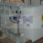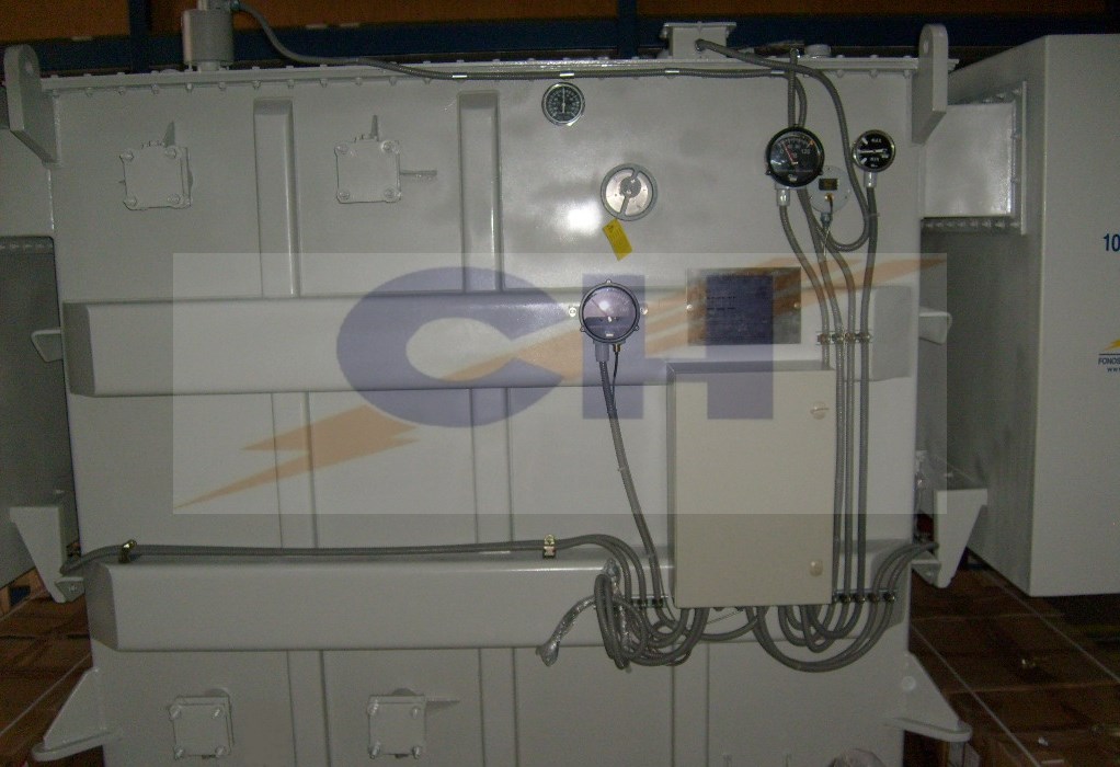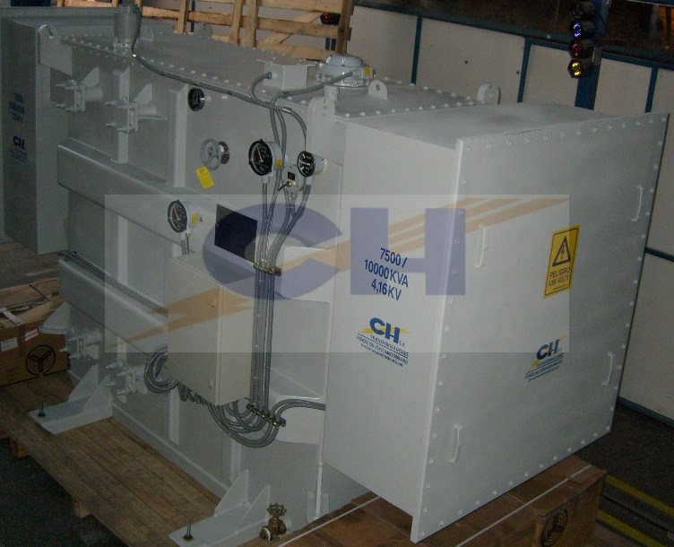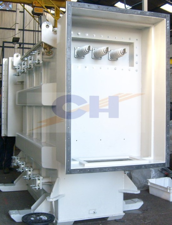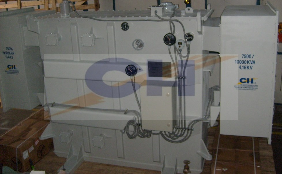 Transformador de Poder trifásico, con cajas laterales independientes herméticas, para bushings primarios y secundarios. Transformador autorefrigerado, sumergido en aceite mineral, tipo intemperie y hermético. El transformador fue diseñado, construido y probado según normas ANSI C 57.12.00 y ANSI C 57.12.90.